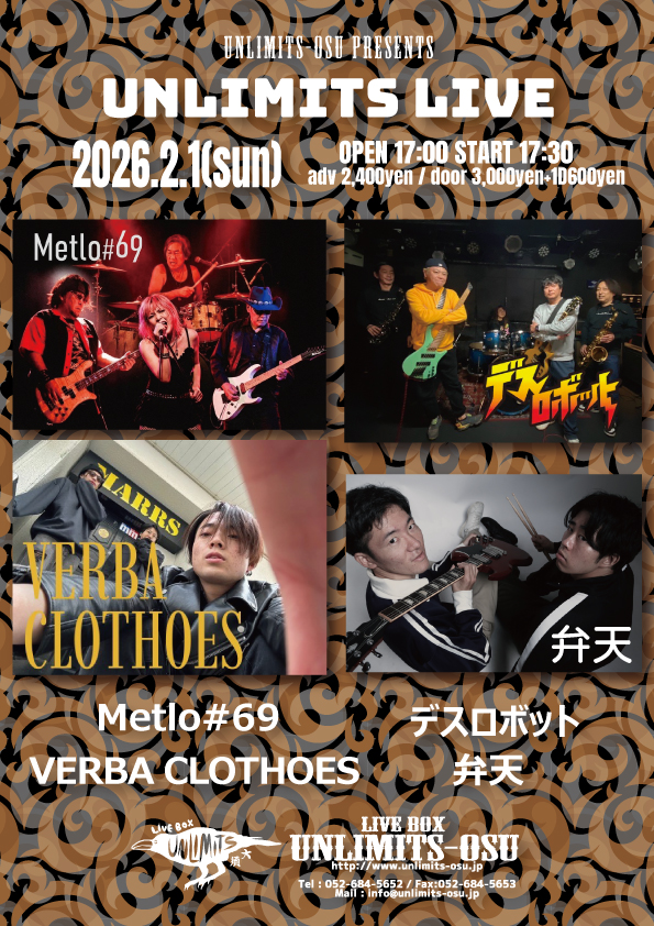 UNLIMITS LIVE Metlo#69/デスロボット/VERBA CLOTHOES/弁天 チケットのご予約はこちら ご予約は各アーティスト及び上記会場予約フォームまで |