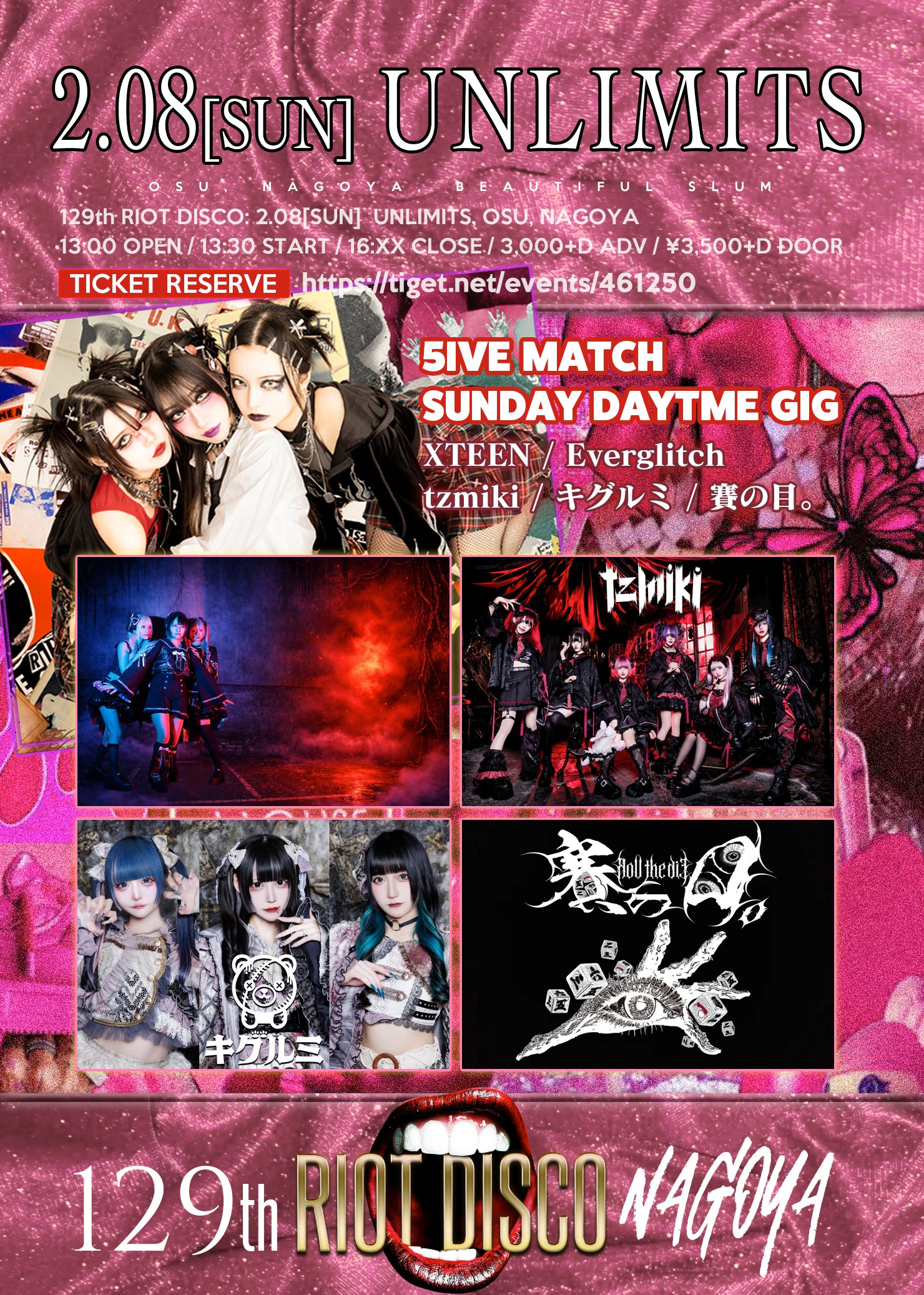 XTEEN IN NAGOYA 2026 KICKS OFF 129thRIOTDISCO NAGOYA&ONE MAN GIG IN NAGOYA- 8IGHT ANNIVERSARY NIGHT - PRE SHOW- XTEEN/Everglitch/tzmiki/キグルミ/賽の目。 昼の部 OPEN 13:00 / START 13:30 ADV¥3,000-/DOOR¥3,500-(1D別¥600-)夜の部 OPEN 18:30 / START 19:00 ADV¥3,000-/DOOR¥3,500-(1D別¥600-) ご予約はこちら→xteen.tokyo/reserve/ |
