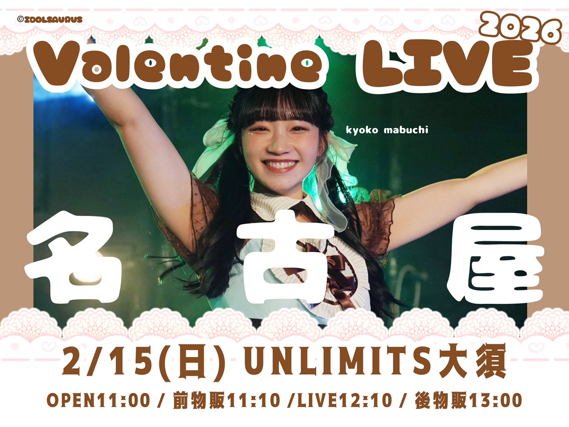 Valentine Live 2026 名古屋 365°/民族ハッピー組 OPEN 11:00/START 12:10 DOOR¥1,500-(1D別¥600-) ご予約はこちら→https://idolsaurus.shop/view/category/ct416 |