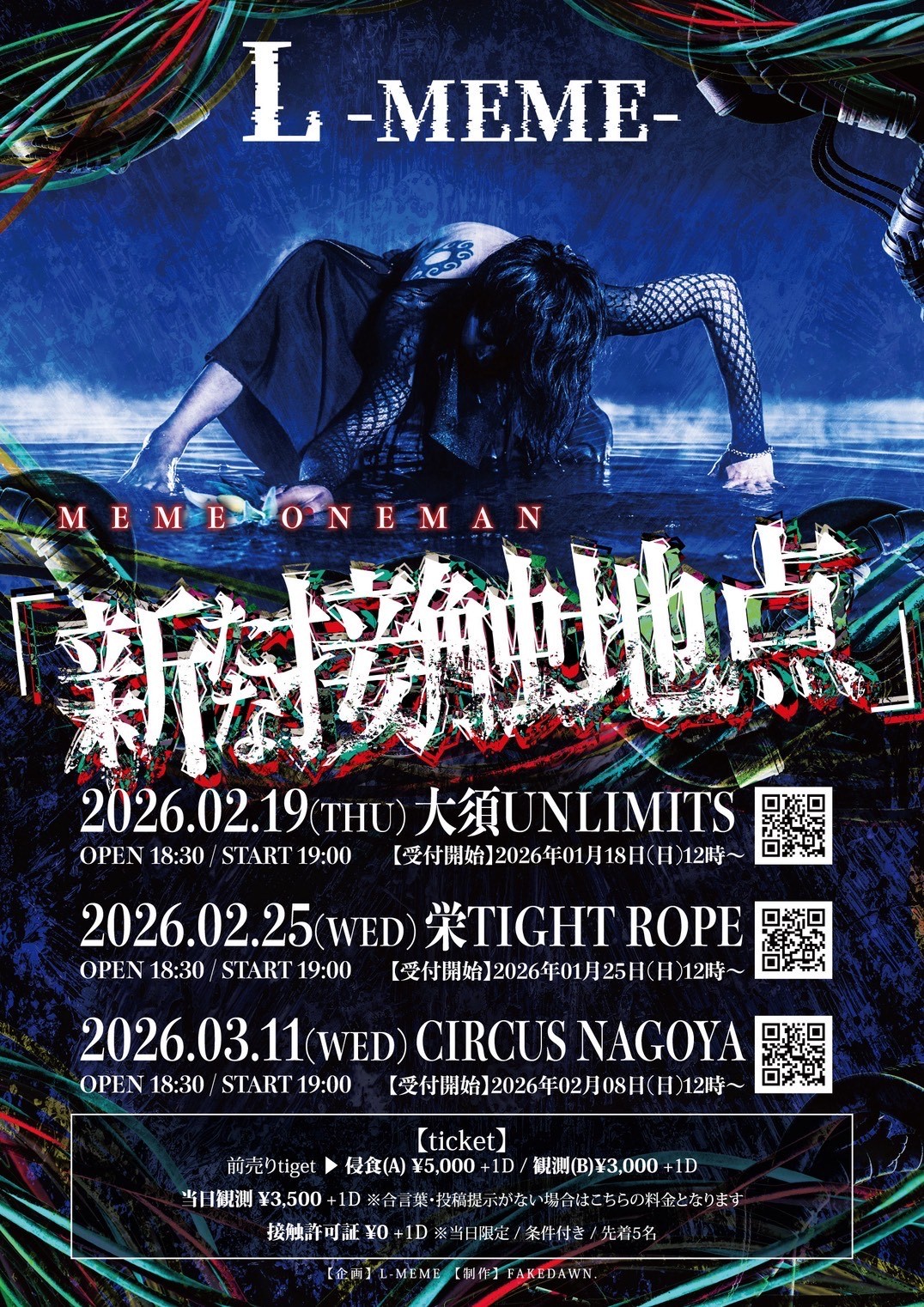MEME ONEMAN 「新たな接触地点」 MEME OPEN 18:30/START 19:00 侵食(A)¥5,000-/観測(B)¥3,000-/当日観測¥3,500-(1D別¥600-) ご予約はこちら→https://tiget.net/events/456647 主催:MEME 企画・制作:L-MEME / FAKEDAWN. |